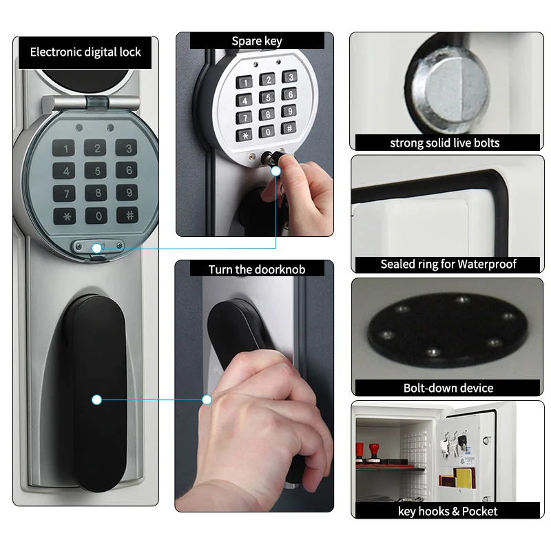Digital media protection;Biometric fingerprint lock;Patented, pry-resistant, concealed hinges;Adjustable shelf, key rack, and door pocket ;Bolt-down feature available