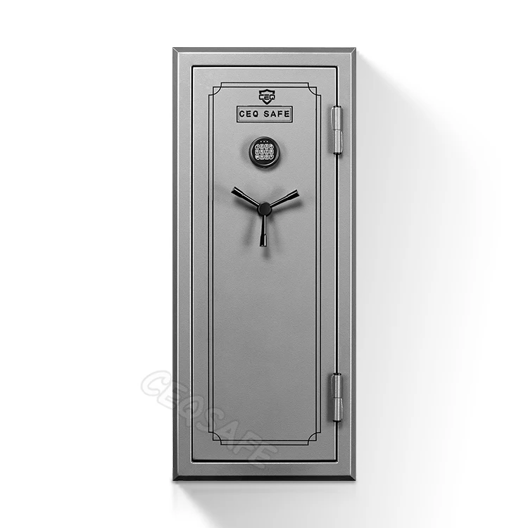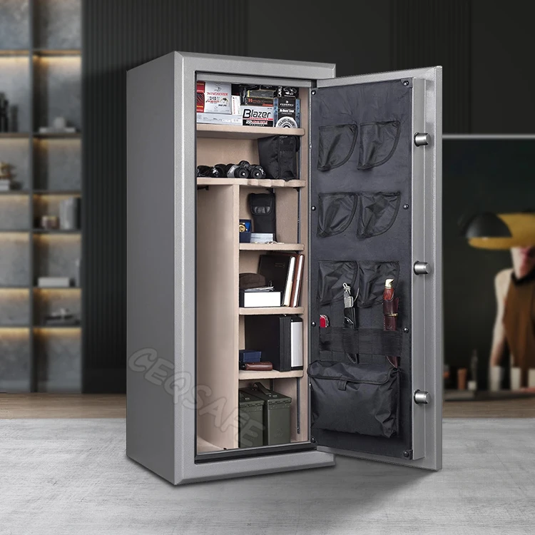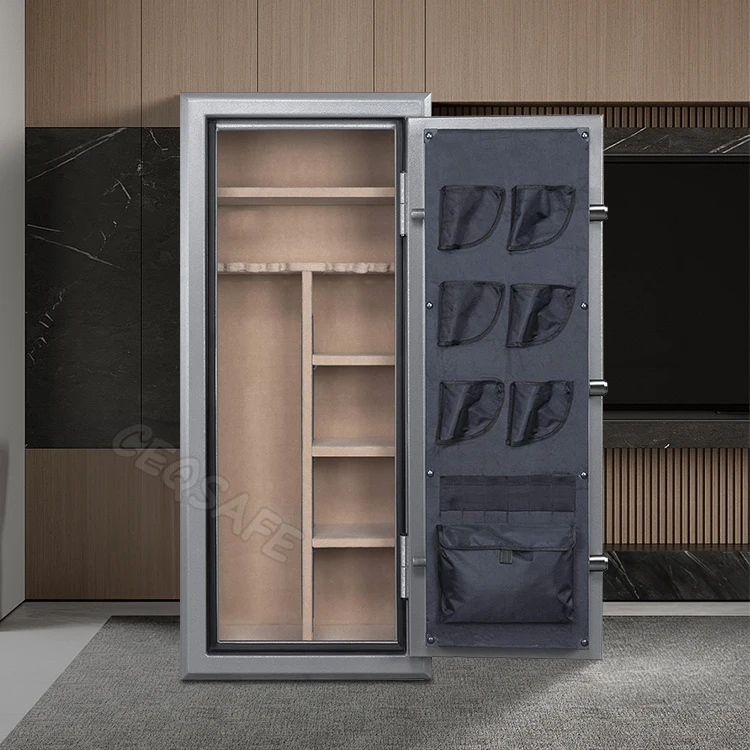 Fully upholstered grey interior that features a two-section gun rack that can store a maximum of 8 long guns per section and includes 4 adjustable/removable shelves for additional storage options