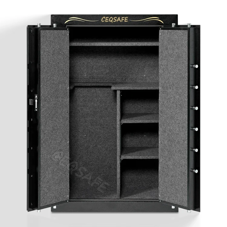 Fully upholstered grey interior that features a two-section gun rack that can store a maximum of 33 long guns per section and includes 4 adjustable/removable shelves for additional storage options
