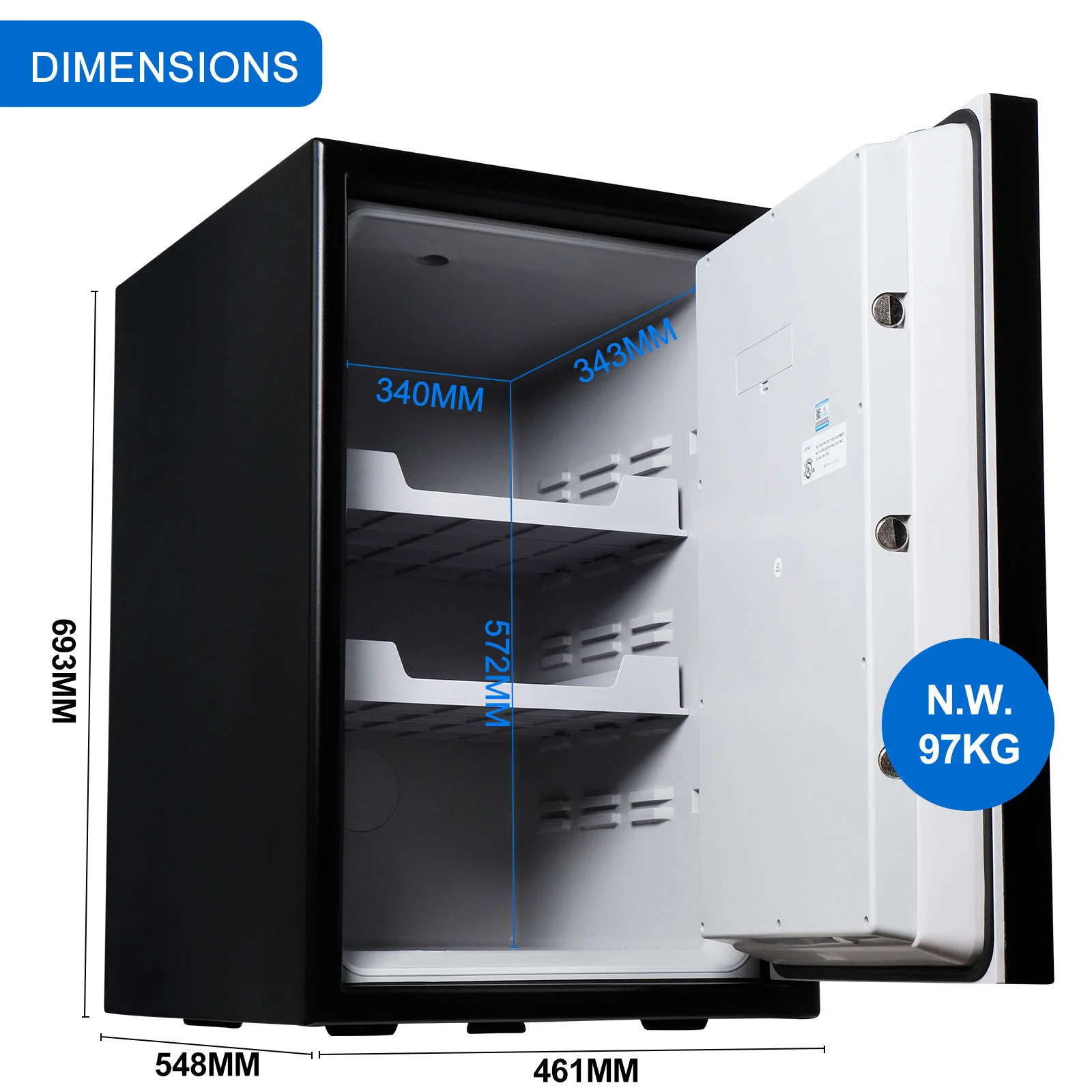 Digital media protection,Mechanical combination lock,Patented, pry-resistant, concealed hinges,Adjustable shelf, key rack and door pocket,Bolt-down feature available